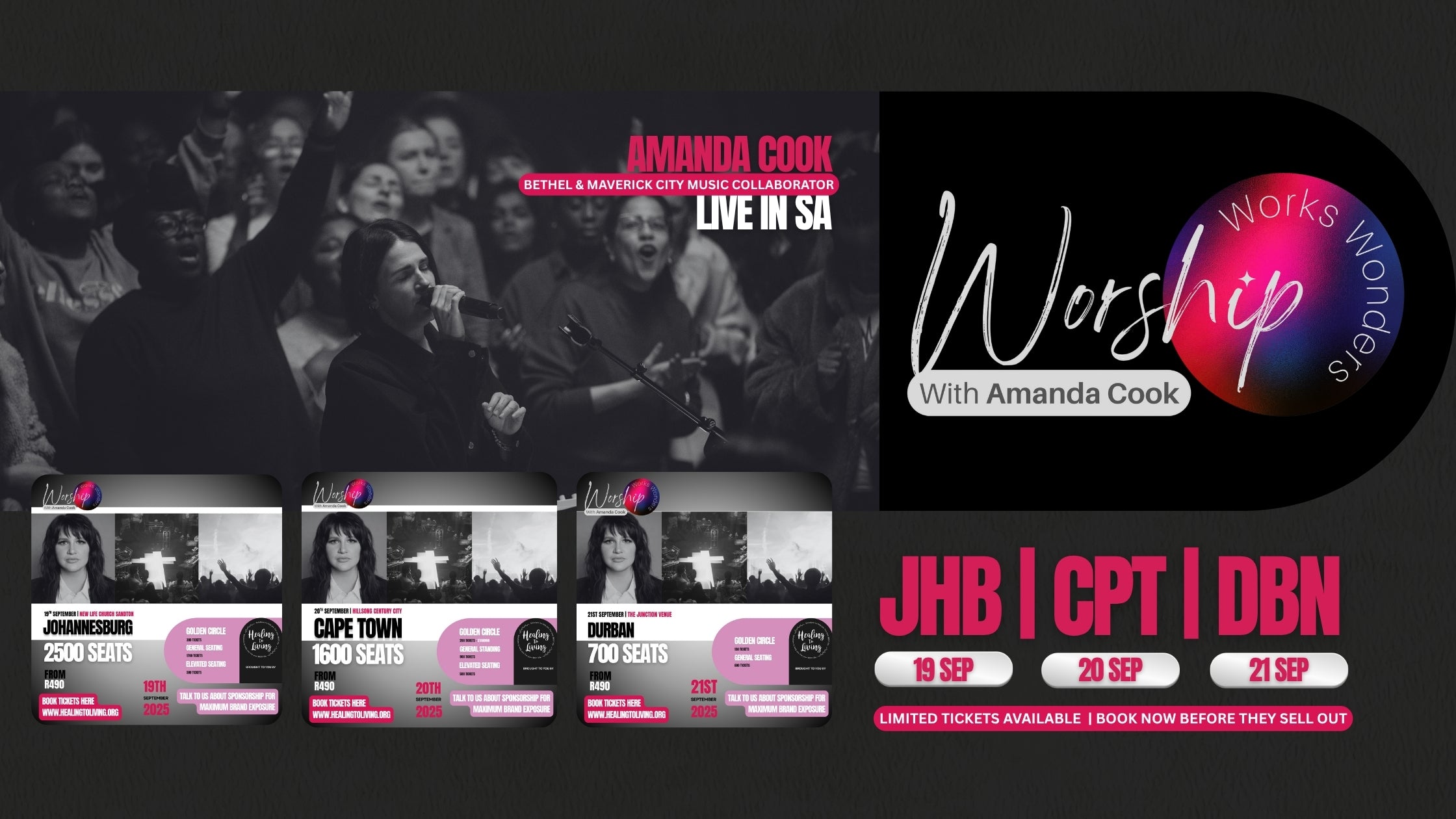 Join renowned singer-songwriterAmanda Cook for 3 nights in JHB, CT and Durban for Worship Works Wonders - a powerful, spirit-filled worship experience like no other. Known for her deeply moving vocals and heartfelt songwriting, Amanda brings her internationally acclaimed worship music to life in an intimate setting designed to ignite faith, healing, and personal breakthrough.